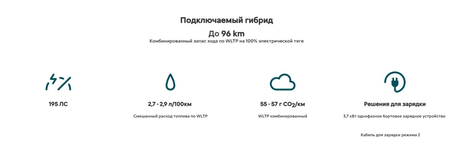 Подключаемая гибридная версия мощностью 195 л.с. выводит новый C5 Aircross на новый уровень. Запас хода на электротяге составляет 96 км*, а в городе — более 100 км. Большой топливный бак объёмом 55 литров обеспечивает запас хода на автомагистрали до 650 км.