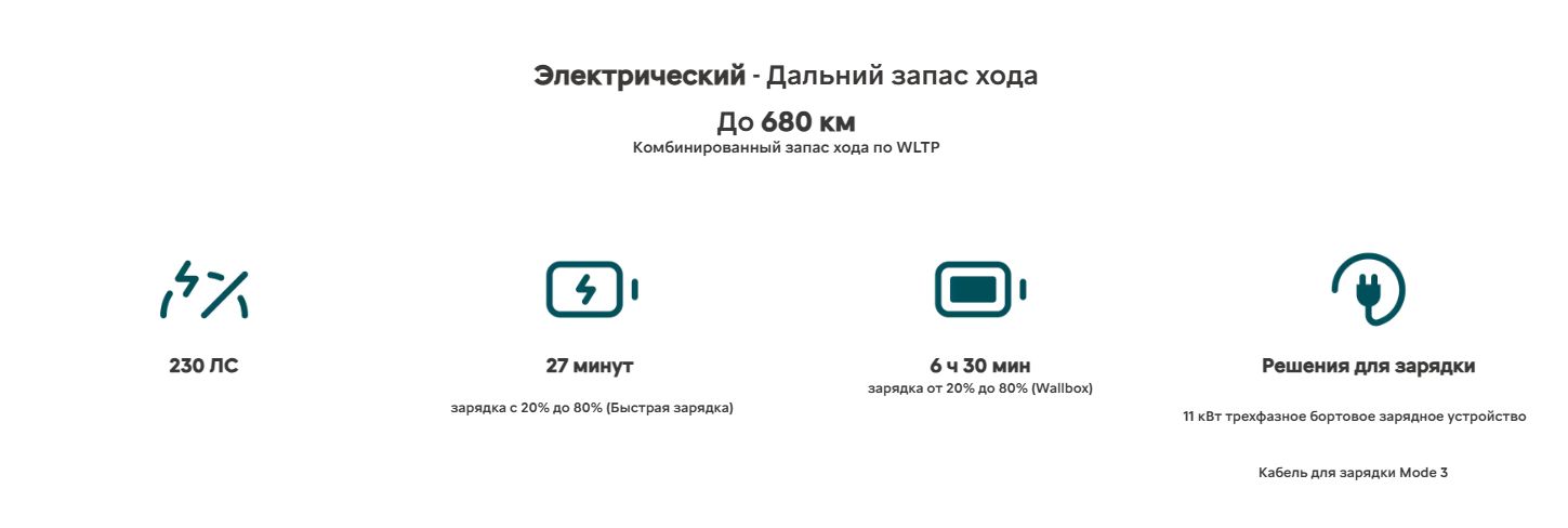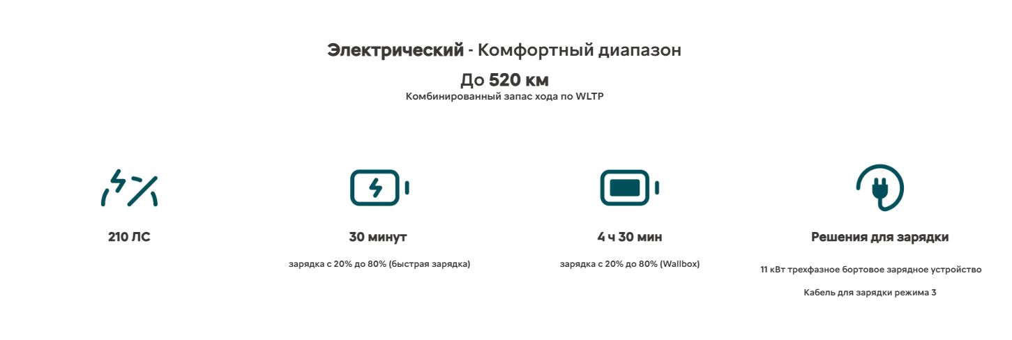 - Версия Comfort Range мощностью 210 л.с. с аккумулятором ёмкостью 73 кВт·ч обеспечивает запас хода до 520 км*.