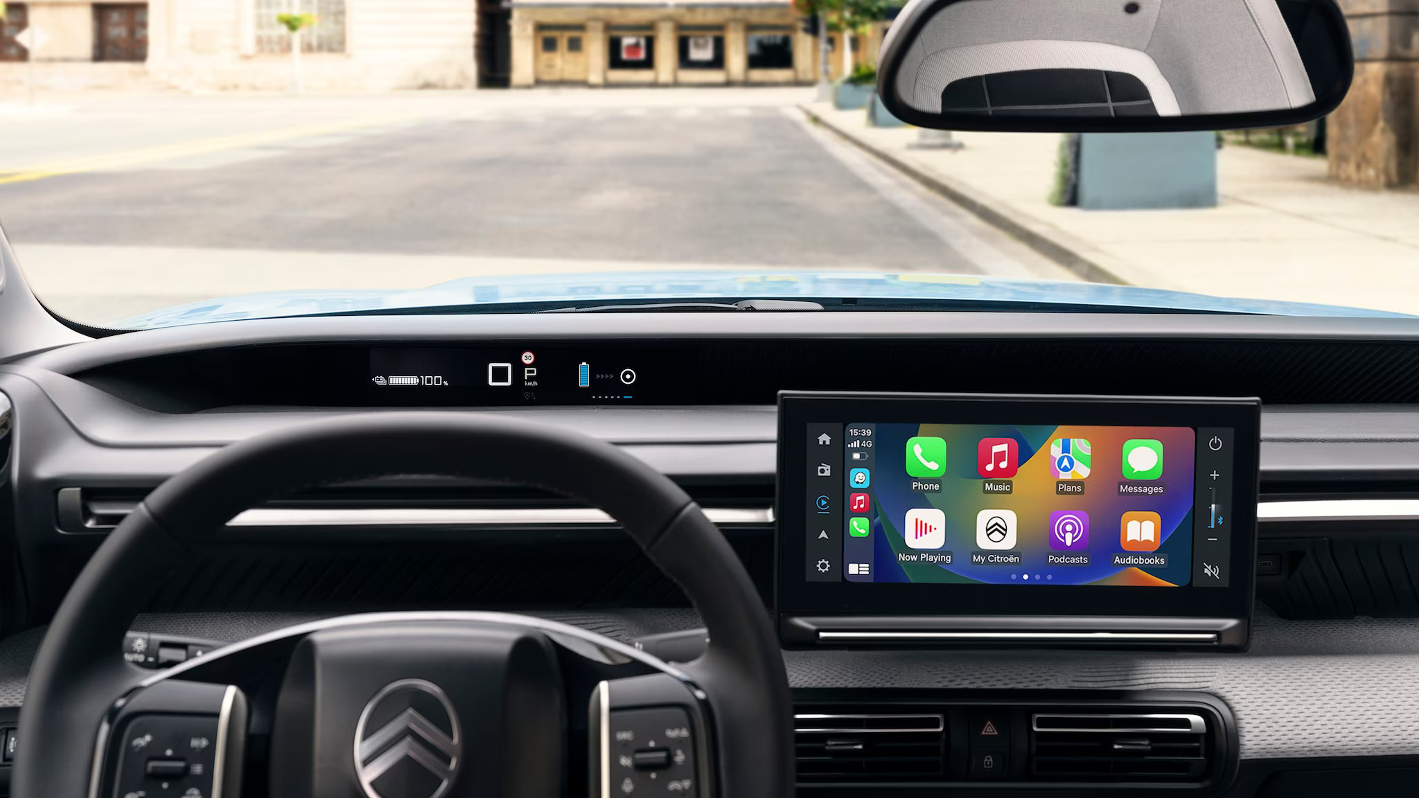 В салоне ë-C3 установлено информационно-развлекательное оборудование, доступное через центральный 10,25-дюймовый сенсорный экран, а также функция беспроводного Wifi, позволяющая дублировать экран смартфона с помощью Apple Carplay и Android Auto. На новом рулевом колесе также расположено большое количество органов управления.